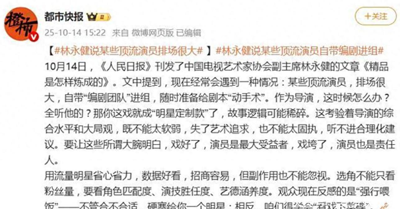 文丨斤斤老戏骨林永健直接在《人民日报》开麦,一句话炸翻热搜:“某些人自带编剧改剧本,把好好故事改得逻辑混乱!”这波“人间清醒”发言,简直说出了观众憋了好几年的心里话!把娱乐圈的“遮羞布”给掀开了!